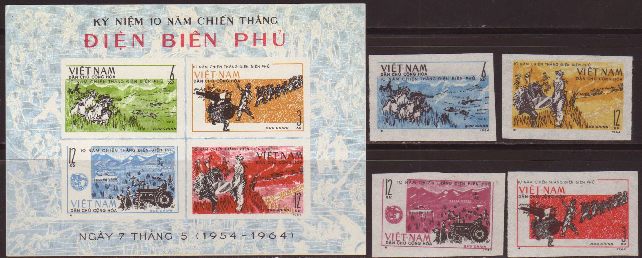 | N81370 | Вьетнам. 1964. 10 лет победы при Дьенбьенфу. Серия 4 марки и сувенирны лист, без зуб. (**) |  | 2040 |  |